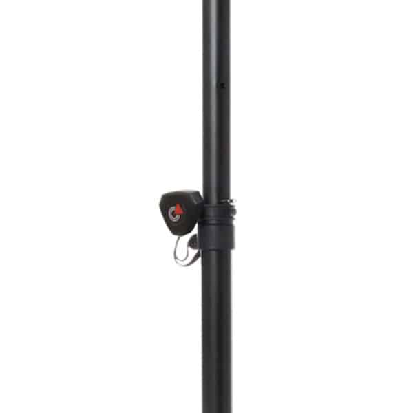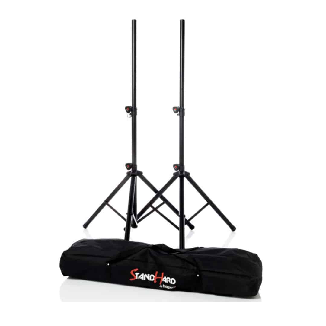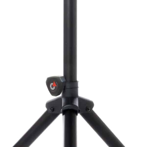 Par de soportes para altavoz con fijación de 35 mm de diámetro. Fabricados en acero. Sistema de ajuste con perilla y pasador de seguridad. Además, incorpora un sistema de resorte integrado en la conexión inferior para un descenso asistido. Bloque central y conexión de patas de nailon reforzado. Patas de goma antideslizantes. Bolsa de nailon antidesgarro con asas reforzadas.